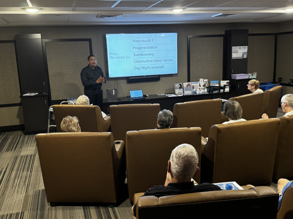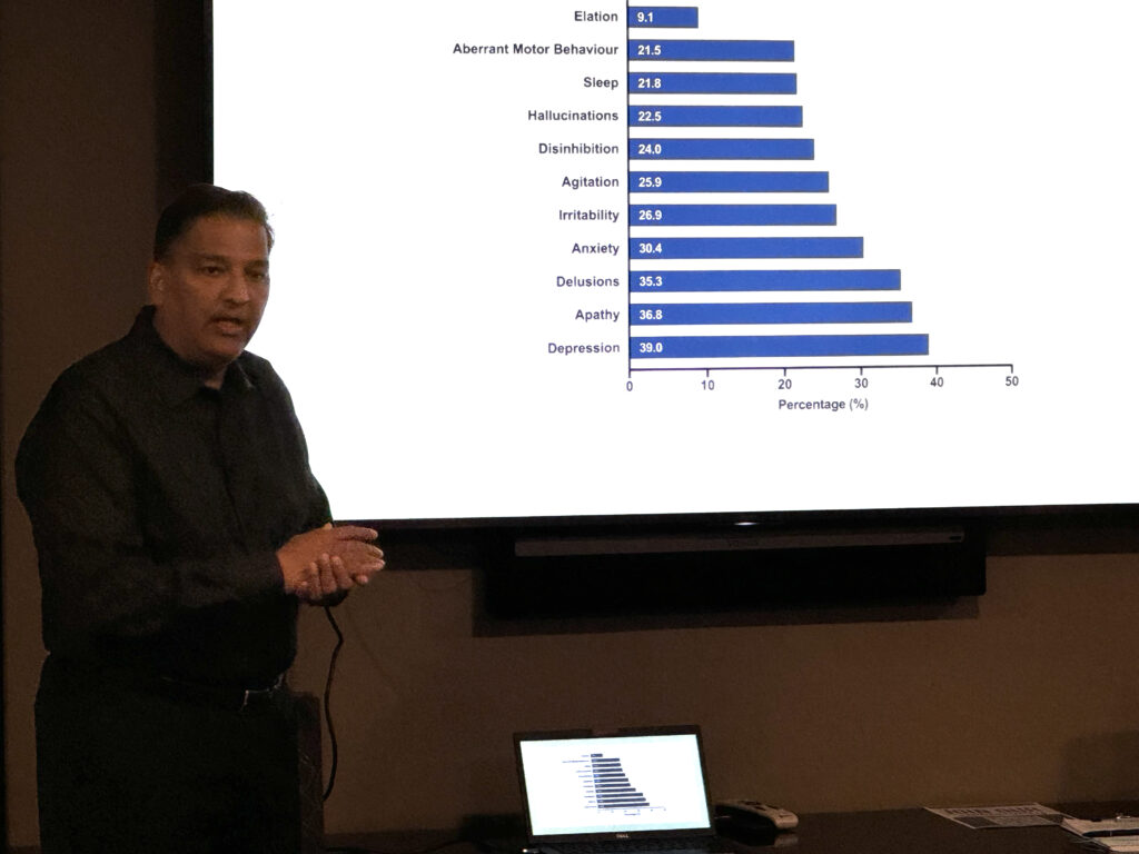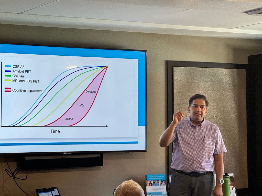 Dr. Pandey’s presentation covered a wide range of topics, including the shift from traditional clinical diagnoses to biomarker-based approaches, the importance of early detection and intervention, and the role of clinical trials in advancing treatment options. He also addressed common lifestyle factors such as dietary impacts on brain health, discussing the benefits of the DASH and MIND diets. Additionally, Dr. Pandey emphasized that the outdated term “senile dementia” has been debunked, underscoring the critical need to modernize our understanding of dementia.