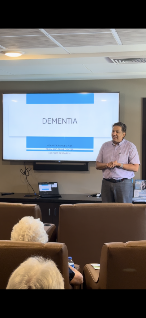 On September 26, 2024, Dr. Hemant K. Pandey, M.D., delivered a compelling presentation to Friendship Village Tempe’s Family Focus Group. He introduced both MD First Research Chandler and the Brain and Spine Center, highlighting the latest advancements in neurology, with a focus on dementia care.