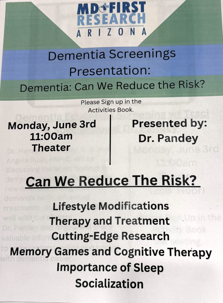 The session built on previous community initiatives, including Dr. Pandey, M.D.’s Dementia Speaker Series and the team’s participation in the Pretty in Pink Fundraiser. Attendees learned about the exclusive benefits of MD First Research Chandler Clinical Research’s innovative clinical trials, including early access to new treatments, fully covered medical care, reimbursement for time and travel, and round-the-clock support.